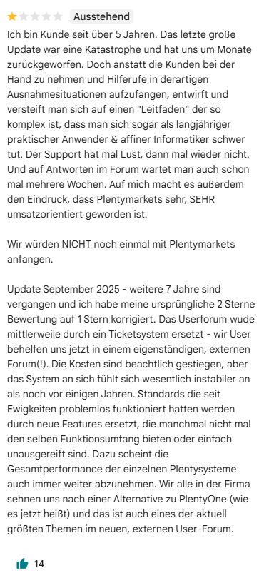 Trustpilot sieht ja noch ok aus, aber bei Google scheint das leider nicht so einfach zu sein. In meinem Fall kann ich zur PlentyOne GmbH mit meinem Konto gar nichts mehr posten, egal was ich in die Rezension reinschreibe - egal ob Änderung oder Löschen + Neu. Keine Chance.
