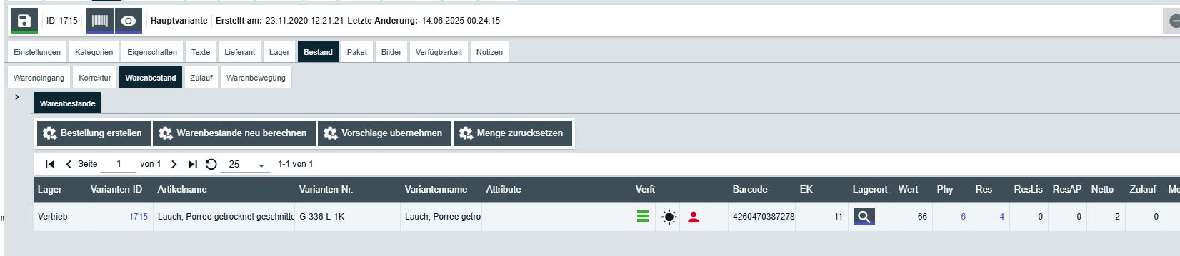 Warenbestände öffnen und Filter einstellen