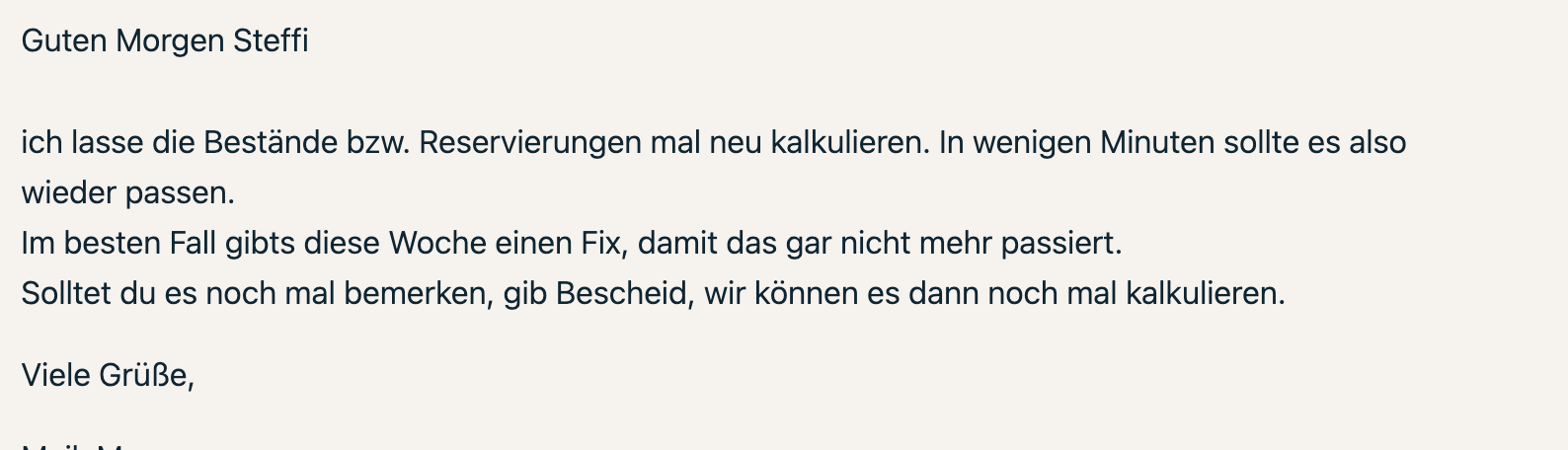 Keine Ahnung was man dazu sagen soll, aber grundsätzlich würde ich behaupten, dass weder die Wartezeit noch die Unzuverlässigkeit 2025 funktioniert. Besonders das „alte“ Aufträge evtl. nicht in Reservierungen einfließen, ist ein absolutes No-Go. Für uns ist der Schaden minimal da wir die normale Ware Auftragsbezogen bestellen und dafür keinen Bestand für, aber die Ware die wir auf Meldebestand bestellen, sind genau die Produkte wo Kunden explizit bei uns bestellen.