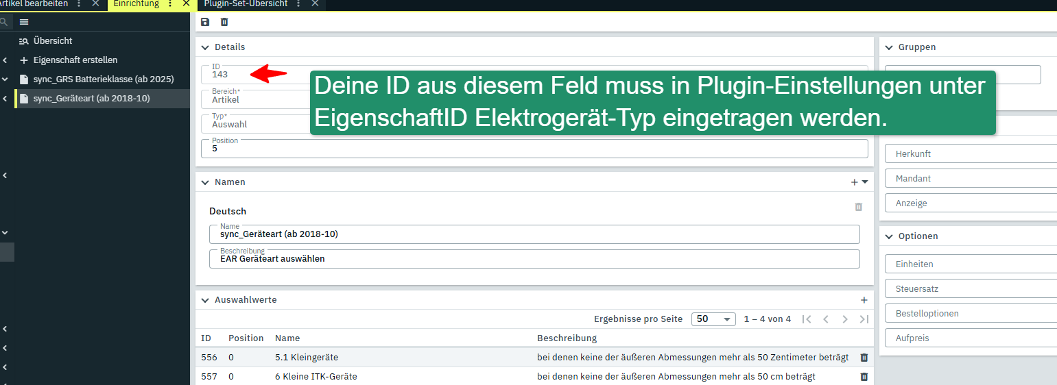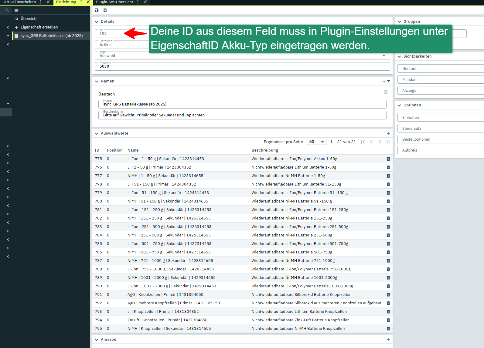 Anmerkung zu den Eigenschaften für BattG und VerpackG Einstellungen. Es müssen Eigenschaften vom Typ Auswahl sein. z. B. wie auf dem folgenden ScreenShot gezeigt.