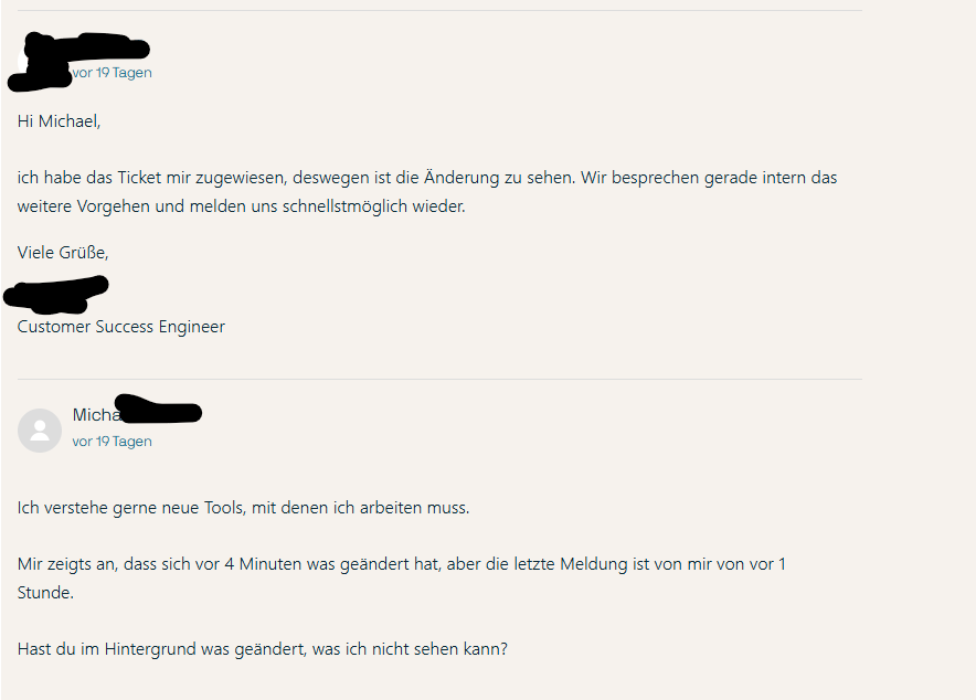 Heute wird bei beiden Tickets angezeigt, dass sie „zuletzt heute bearbeitet“ wurden – jedoch ohne neue Antwort. Es wirkt, als hätte lediglich jemand den Zeitstempel aktualisiert, wodurch der Eindruck entsteht, dass eine Aktivität stattgefunden hat, obwohl ich weiterhin auf eine Rückmeldung warte.