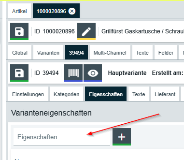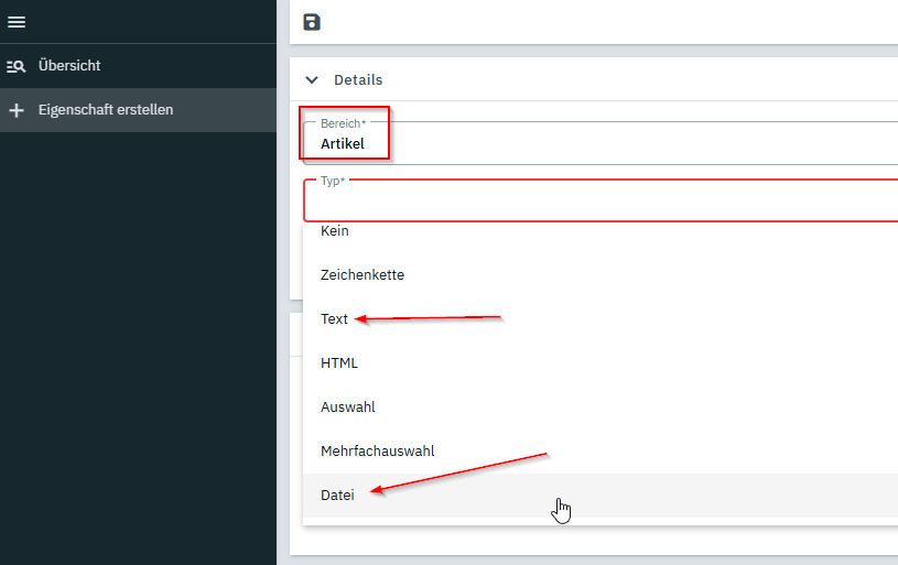 in deinem Screenshot bist du an der falschen Stelle. Du kannst wie gesagt Eigenschaften erstellen, entweder vom Typ Datei oder vom Typ Text. Diese sind dann bei einzelnen Varianten pflegbar.