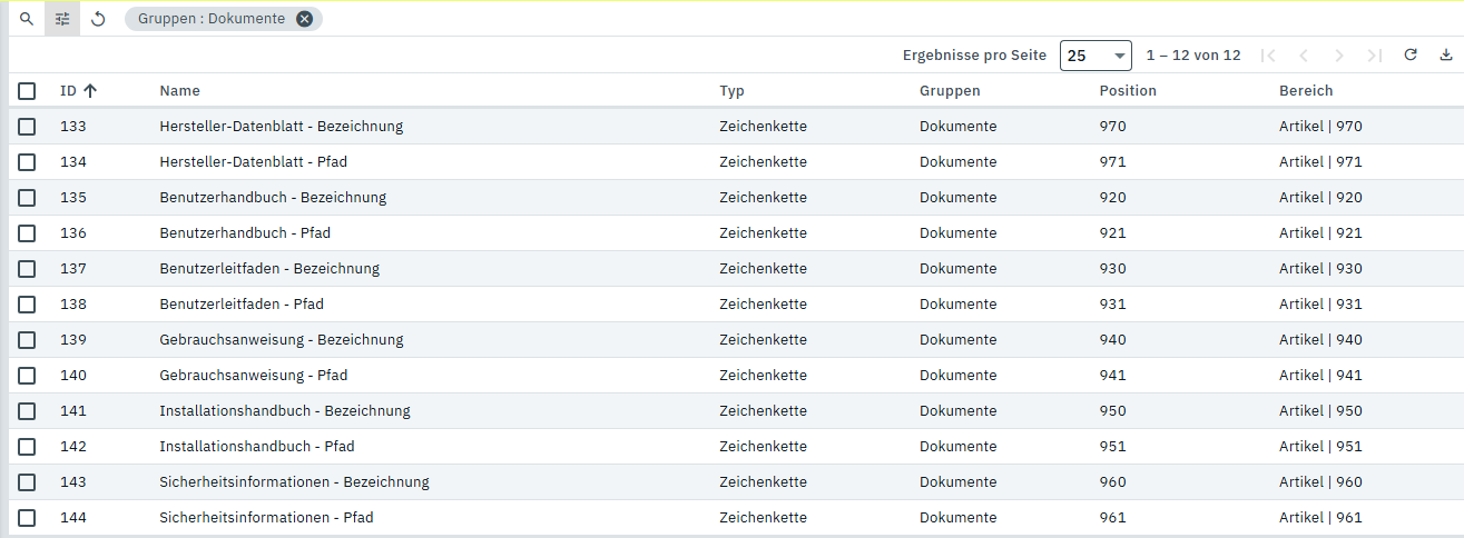 Diese Eigenschaften werden dann im Frontend als Link ausgegeben oder bei Amazon dem richtigen Feld zugeordnet. Die Bezeichnungsfelder werden bei uns im Frontend verwendet, wenn ein Dokument umbenannt wird, weil es halt kein Anleitung, sondern als Bauanleitung betitelt wird.
