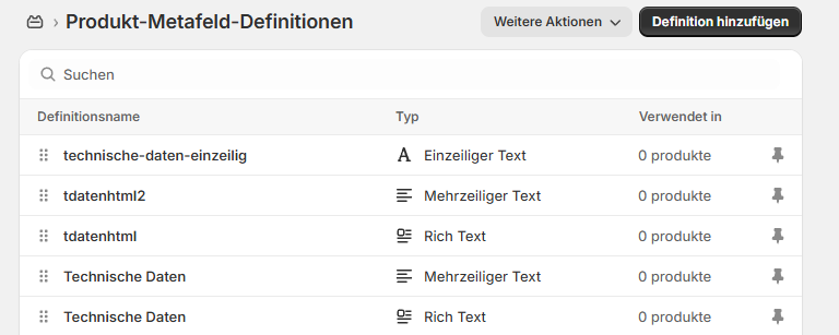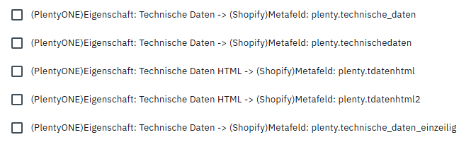 Wir richten aktuell einen Shopify-Shop ein und haben Probleme mit den Metafeldern. Wir möchten gerne das Textfeld “Technische Daten” aus Plenty mit nach Shopify nehmen, da es wichtige Daten enthält. Jedoch führte bisher kein Test zum Ziel.
