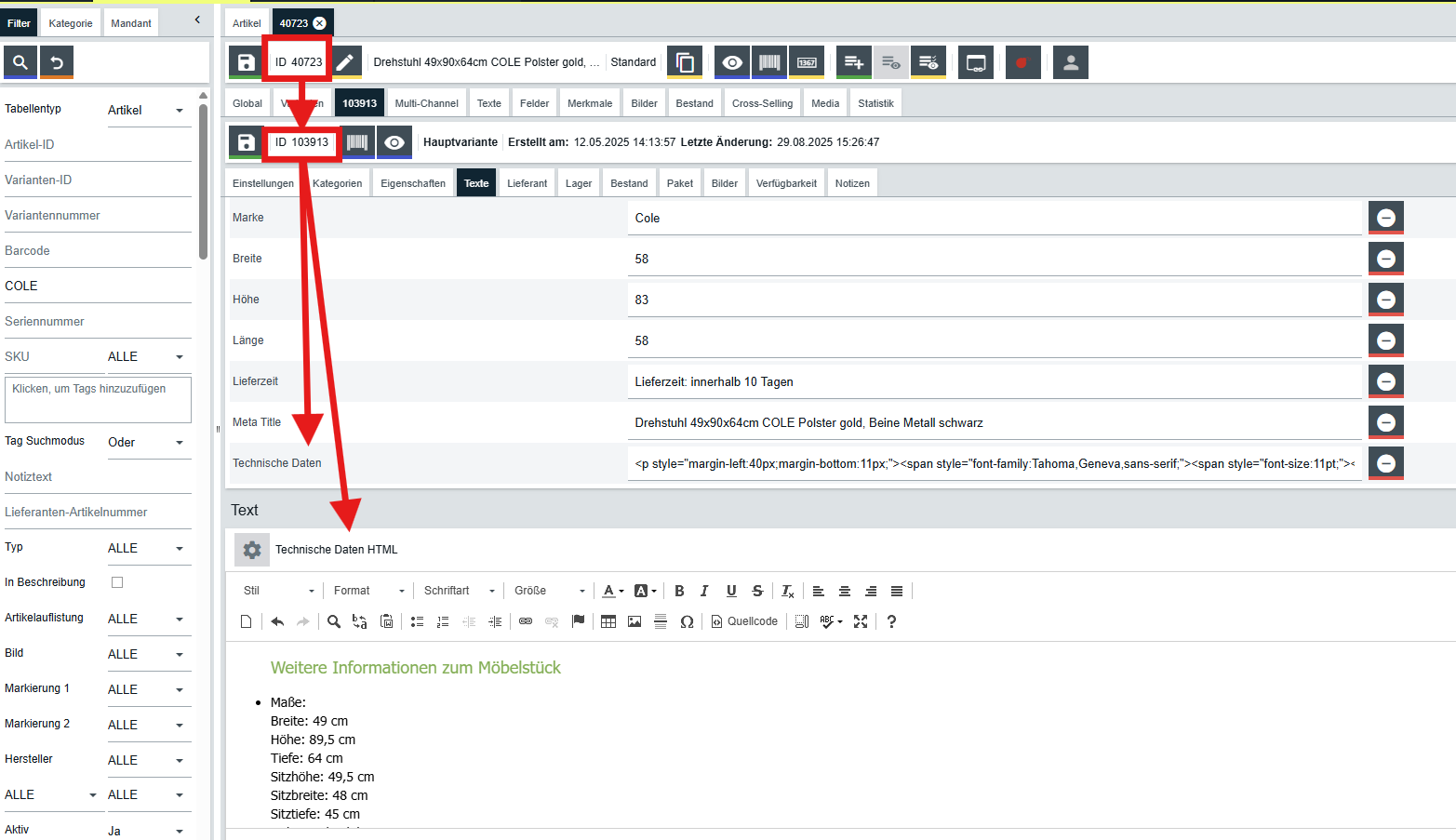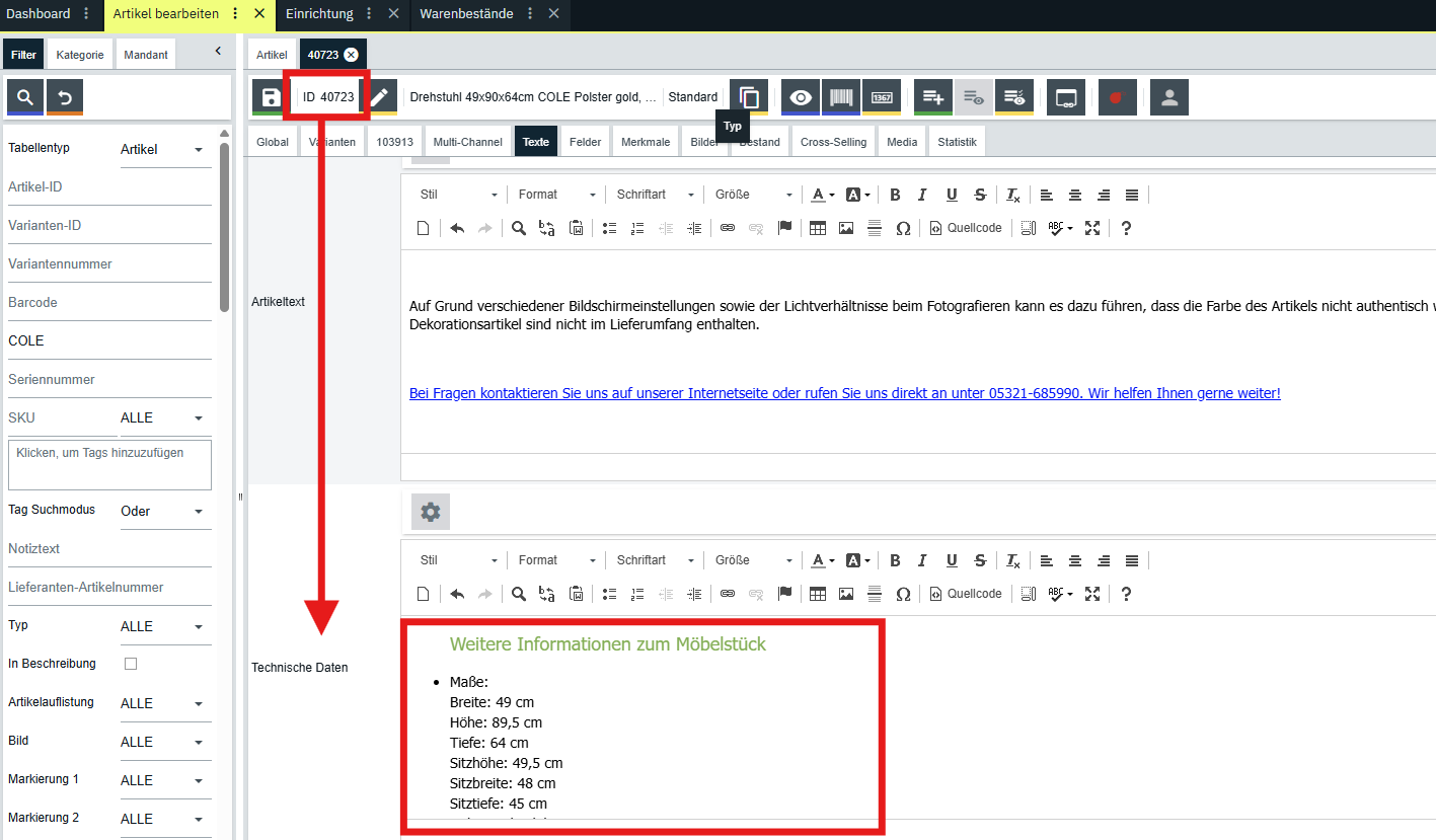 - Die technischen Daten haben wir als Eigenschaft angelegt, da das Textfeld “Technische Daten” standardmäßig nicht angesprochen wird.