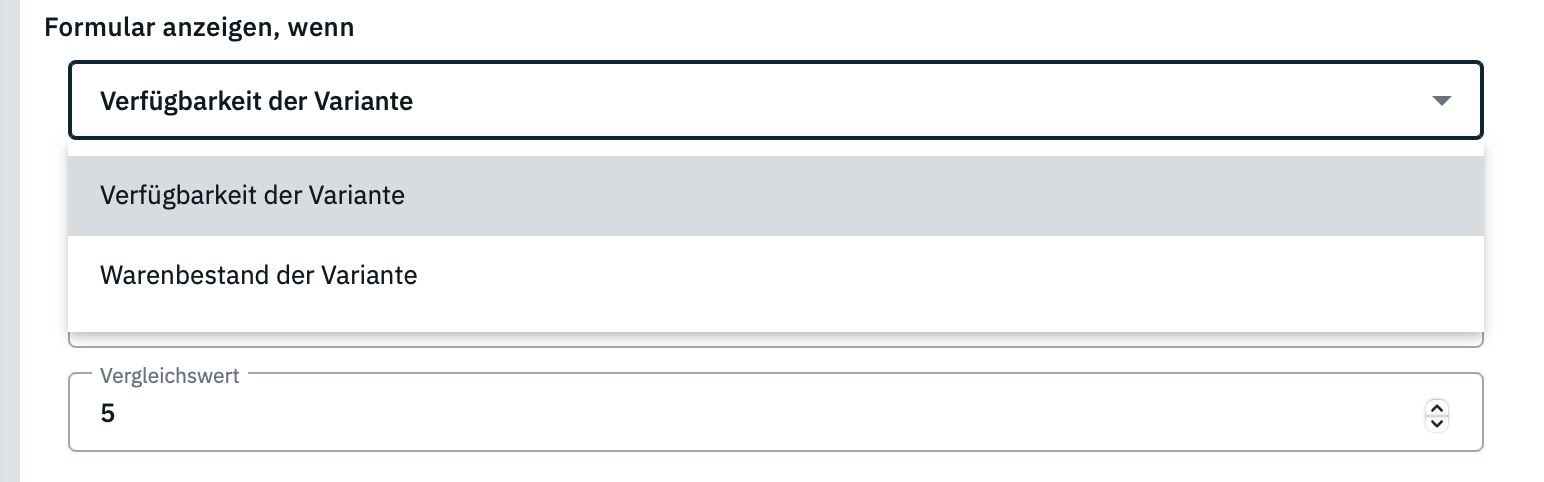 Wenn man an der Variante die automatische Umschaltung anhand vom Bestand nutzt, dann würde ich Verfügbarkeit der Variante wählen. Bei uns wird anzeigt wenn die Verfügbarkeit 5 ist. Also wenn Variante nicht lagernd ist.