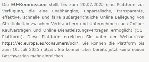 Die Europäische Kommission stellt bis zum 20.07.2025 eine Plattform für die außergerichtliche Online-Streitbeilegung (OS-Plattform) bereit, aufrufbar unter https://ec.europa.eu/consumers/odr. Sie können die Plattform bis zum 19. Juli 2025 nutzen. Sie können aber bereits jetzt keine neuen Beschwerden mehr einreichen.
