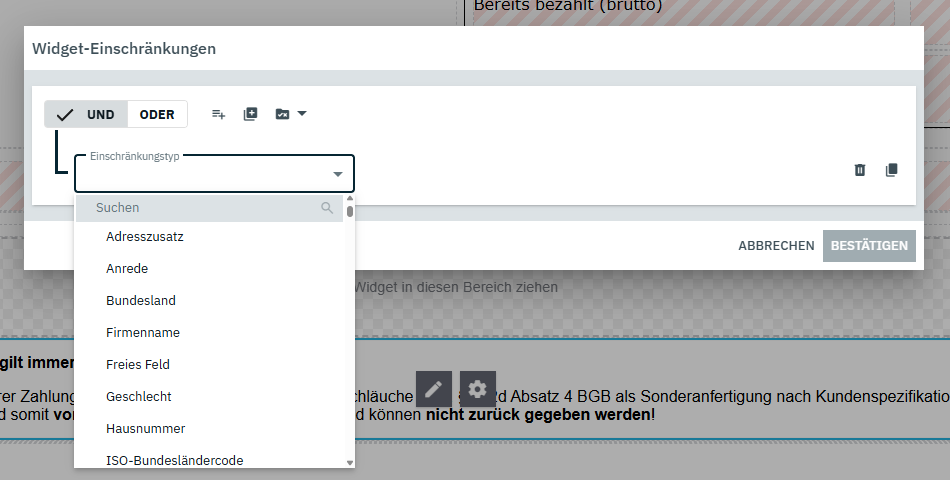 Du musst in das Feld, welches du beschränken möchtest und dort auf das Zahnrad. Dann öffnet sich auf der rechten Seiten der Bereich.